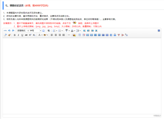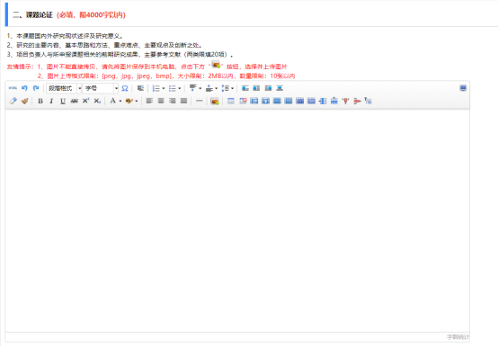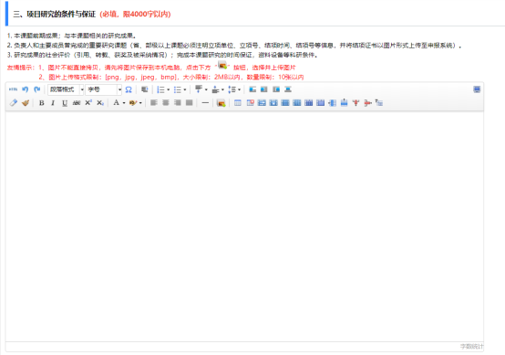? 為了能完整在A4紙上打印申報(bào)評(píng)審書內(nèi)容,您上傳的圖片如果寬度超過595像素,系統(tǒng)自動(dòng)將圖片壓縮成寬度不超過595像素的圖像副本然后上傳。同時(shí),也請(qǐng)您在編輯申報(bào)評(píng)審書內(nèi)容時(shí),確保圖片寬度不要超過595像素,且不要將大圖片與文本排版在同一行。
