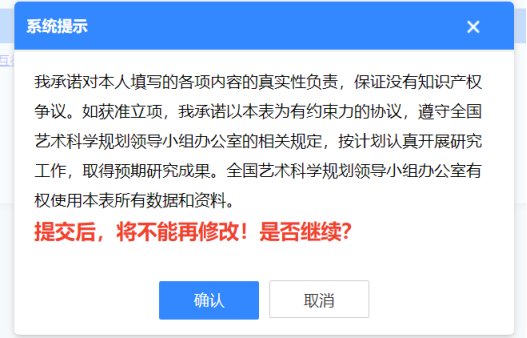 6) 閱讀并同意“項(xiàng)目提交申請(qǐng)承諾”后,點(diǎn)擊“確認(rèn)”按鈕,系統(tǒng)會(huì)將項(xiàng)目提交到所屬單位進(jìn)行審批。提交成功后,項(xiàng)目將不允許再進(jìn)行修改。