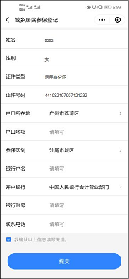 第二步:點擊“城鄉(xiāng)居民參保登記”圖標,填寫城鄉(xiāng)居民參保登記所需的頁面數(shù)據(jù),完成后點擊提交信息,粵醫(yī)保通過接口獲取變更結(jié)果的信息并在前端頁面進行展示。