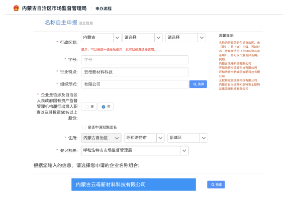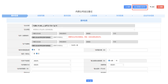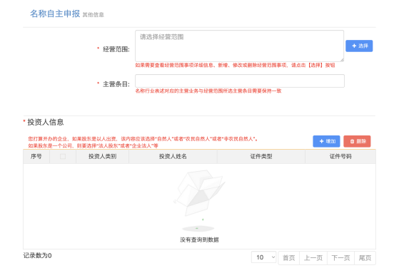 4、進(jìn)入名稱申報頁面(如在引導(dǎo)頁面未選擇名稱,則會直接進(jìn)入設(shè)立頁面),根據(jù)實(shí)際情況填寫表單中的必填信息