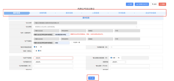 2、按照頂部的導(dǎo)航,填寫對應(yīng)的信息,填寫完成后點(diǎn)擊下一步直至全部填寫完成(如需修改已填信息可以點(diǎn)擊「上一步」進(jìn)行修改)