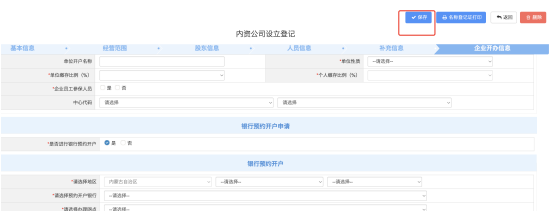 3、如果中途想要暫存,可以點(diǎn)擊右上角「保存」按鈕,之后從保留企業(yè)端「我的業(yè)務(wù)」或政務(wù)網(wǎng)「暫存辦件」中繼續(xù)辦理即可