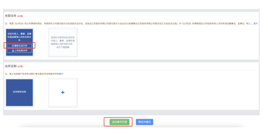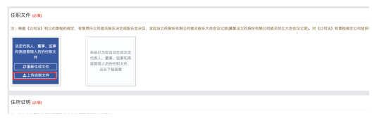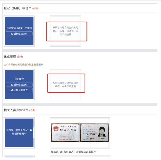 7、此處以內(nèi)資公司設(shè)立為例,系統(tǒng)會將“申請書”“企業(yè)章程”“任職文件”自動生成,將實(shí)名認(rèn)證身份證自動上傳,點(diǎn)擊對應(yīng)材料可以進(jìn)行預(yù)覽