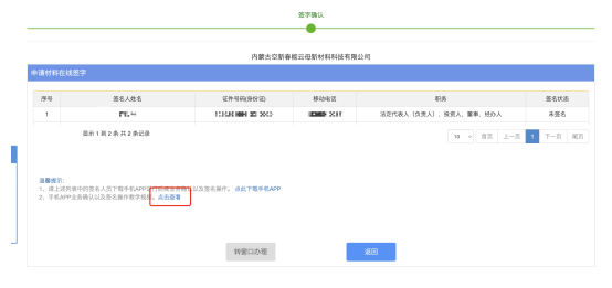 12、提交完成后,會進(jìn)入簽字確認(rèn)頁面。系統(tǒng)會將需要簽字人的名字展示在列表中,具體簽字操作可點(diǎn)擊「操作教學(xué)視頻」進(jìn)行查看