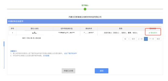 14、簽字完成后,簽名狀態(tài)會變?yōu)椋汉炞殖晒?。列表中展示的全部?/span>員簽字完成后,申請會自動提交