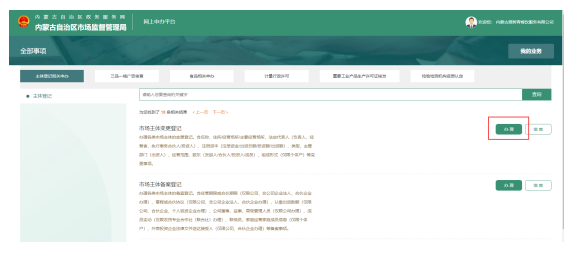 以內(nèi)資公司變更為例,點(diǎn)擊「我要申請」,選擇「主體相關(guān)申辦」-「市場主體變更登記」,點(diǎn)擊「辦理」按鈕