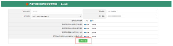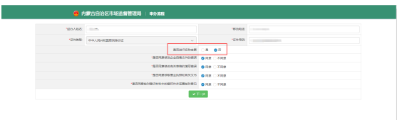 進(jìn)入辦理頁面后,首先對經(jīng)辦人權(quán)限進(jìn)行勾選,勾選完成后點(diǎn)擊「下一步」進(jìn)入填報頁面,如需變更名稱,把“是否進(jìn)行名稱變更”選擇為“是”即可