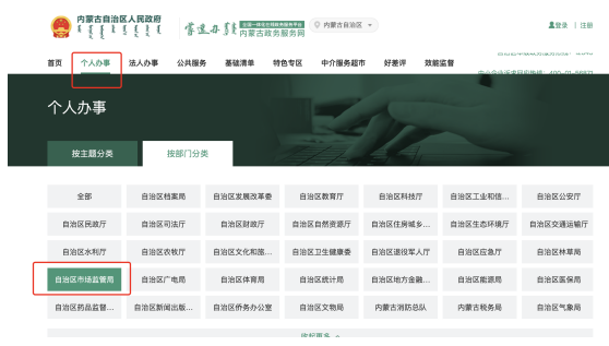1、點(diǎn)擊個人辦事-按部門分類-自治區(qū)市場監(jiān)管局。