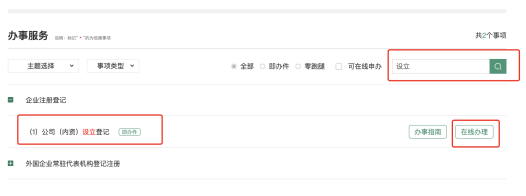 2、選擇自治區(qū)市場監(jiān)管局后,通過搜索框輸入“設(shè)立”或直接在下方展示的辦事服務(wù)列表中找到「企業(yè)注冊登記」