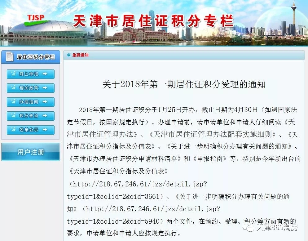 2018年第一期居住證積分于1月25日開(kāi)辦,截止日期為4月30日(如遇國(guó)家法定節(jié)假日,按國(guó)家規(guī)定執(zhí)行)。辦理申請(qǐng)前,請(qǐng)申請(qǐng)單位和申請(qǐng)人仔細(xì)閱讀《天津市居住證管理辦法》、《天津市居住證管理辦法配套實(shí)施細(xì)則》、《天津市居住證積分指標(biāo)及分值表》、《關(guān)于進(jìn)一步明確積分辦理有關(guān)問(wèn)題的通知》、《天津市辦理居住證積分申請(qǐng)材料清單》和《申報(bào)指南》等,特別是今年新出臺(tái)的《天津市居住證積分指標(biāo)及分值表》、《關(guān)于進(jìn)一步明確積分辦理有關(guān)問(wèn)題的通知》兩個(gè)文件,在預(yù)約、受理、積分等方面有新的要求,申請(qǐng)單位和申請(qǐng)人應(yīng)按規(guī)定執(zhí)行。