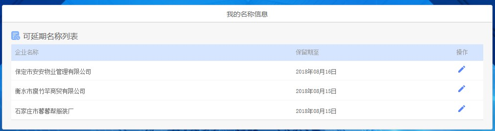 在名稱自主申報系統(tǒng)的首頁,點擊【名稱延期】,可以對保留期內(nèi)的名稱進行延期操作。