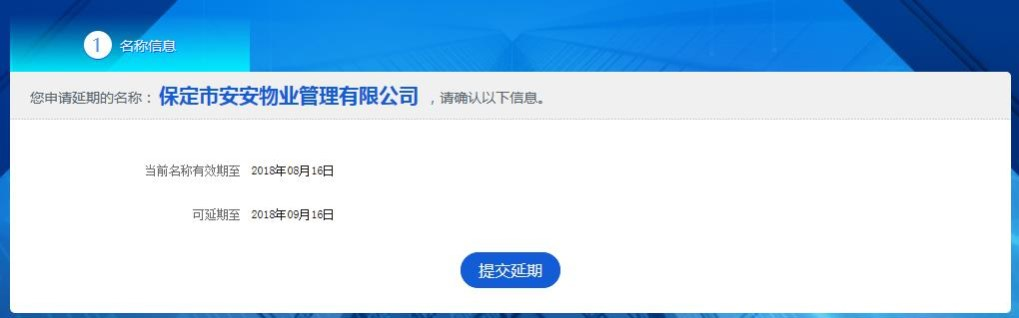 選擇要延期的企業(yè)名稱,進行延期操作,系統(tǒng)會提示每個名稱只有一次延期的機會,延期后的名稱保留期限向后加30天。