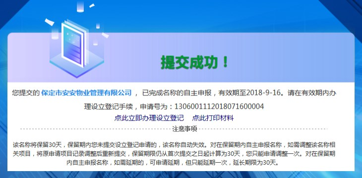 提交成功后,會顯示名稱自主申報的有效期和申請?zhí)?,請在有?/span>期內(nèi)辦理設(shè)立登記手續(xù)。