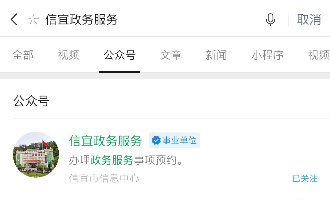 打開微信搜一搜,輸入“信宜政務(wù)服務(wù)”搜索公眾號,點(diǎn)擊關(guān)注。