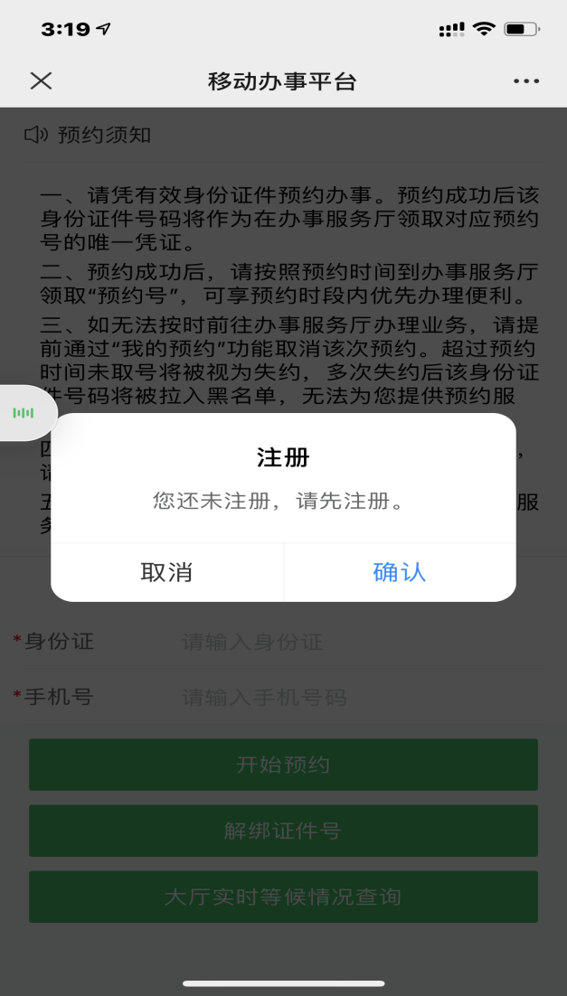關(guān)注“信宜政務(wù)服務(wù)”公眾號后,點(diǎn)擊在線預(yù)約進(jìn)入下一步。如未注冊賬號,將提示“您還未注冊,請先注冊”,然后輸入身份證號、手機(jī)號注冊;如已注冊,則直接第三步“開始預(yù)約”。