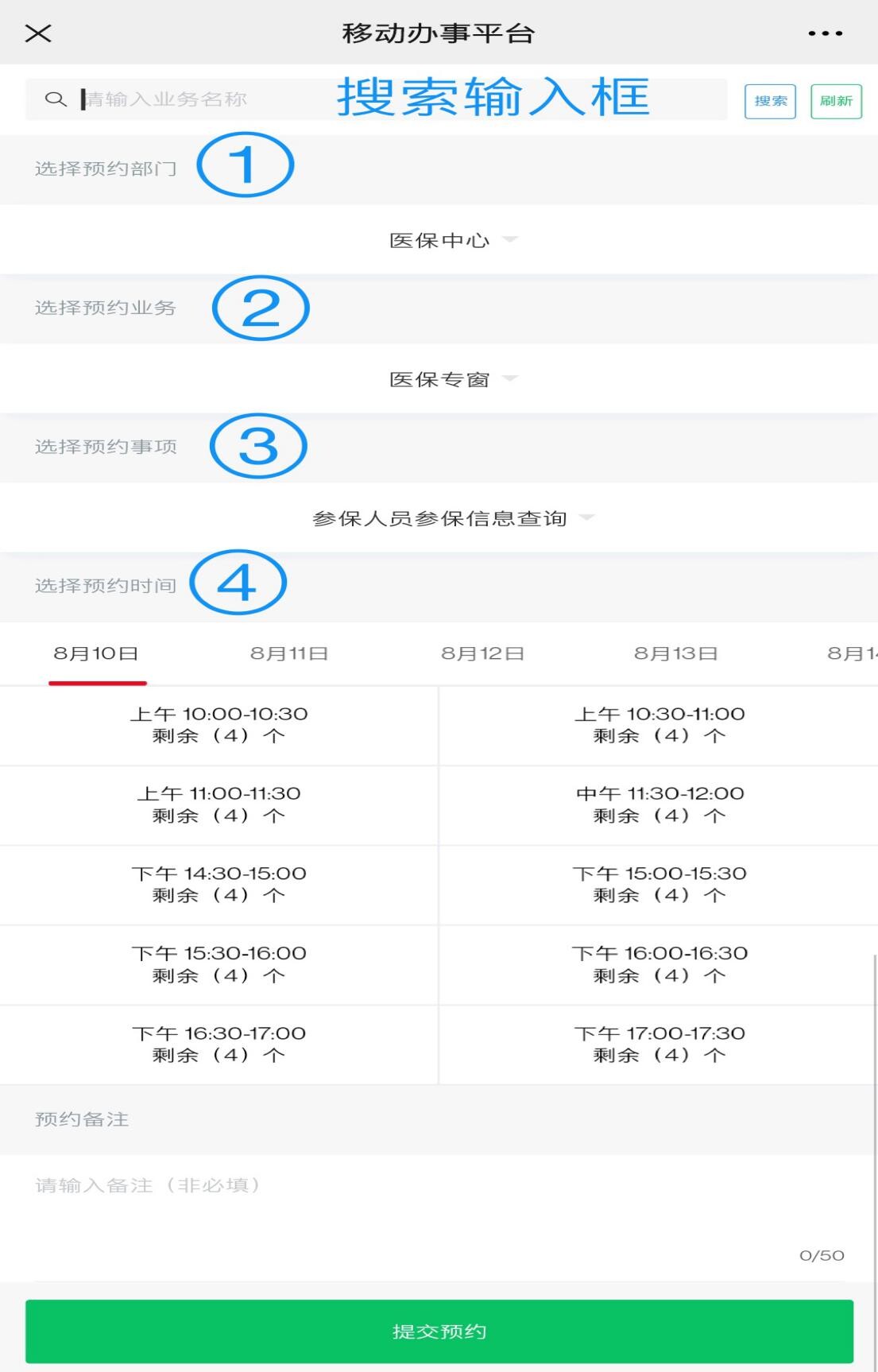 進(jìn)入預(yù)約詳情頁,可以選擇“預(yù)約部門->預(yù)約業(yè)務(wù)->預(yù)約事項(xiàng)->預(yù)約時(shí)間”,也可以“直接搜索需要辦理的事項(xiàng)名稱->預(yù)約時(shí)間”,最后“提交預(yù)約”即可預(yù)約成功。