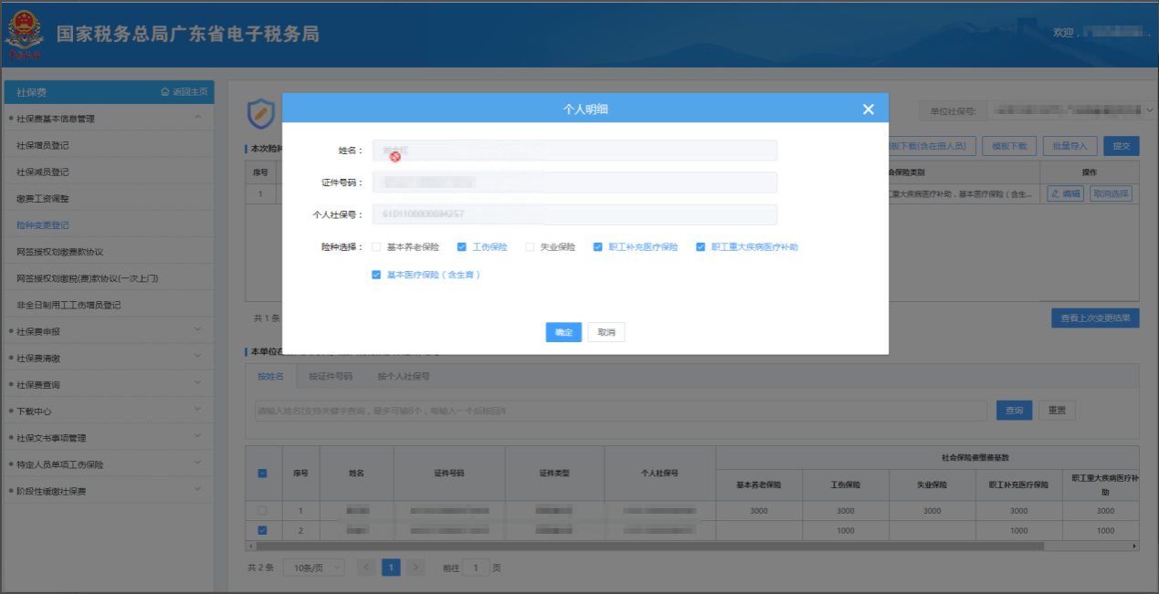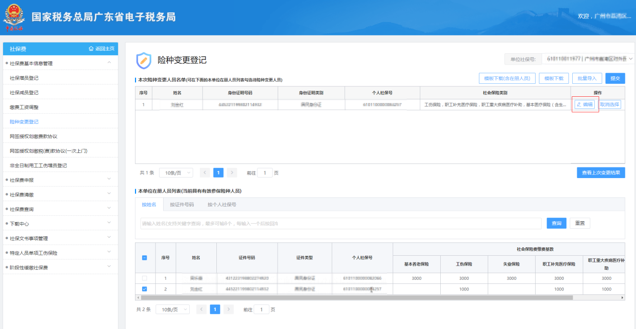 【編輯】:打開(kāi)【個(gè)人明細(xì)】頁(yè)面,可修改人員的參保險(xiǎn)種;