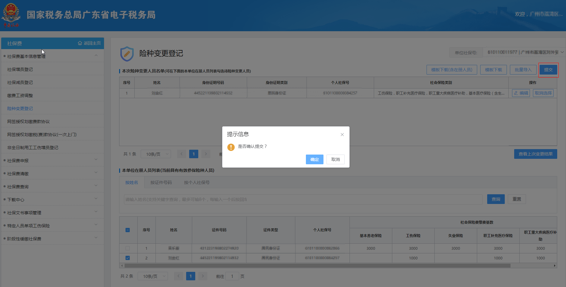 【提交】:提交【本次險(xiǎn)種變更人員名單】下的所有險(xiǎn)種變更人員信息;