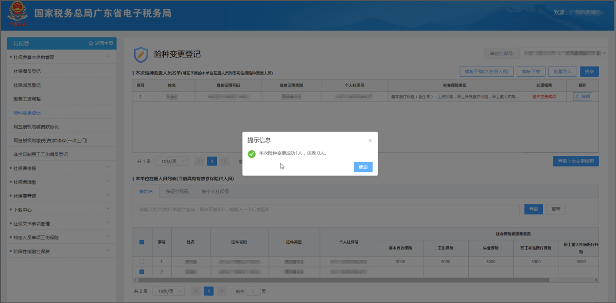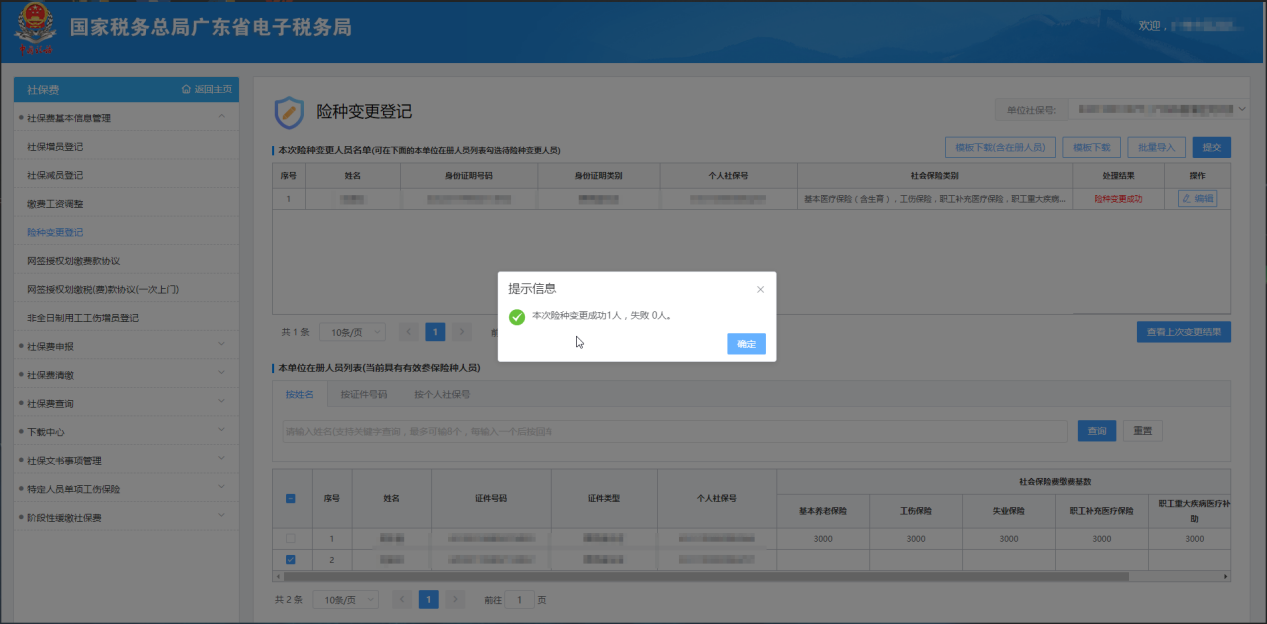 【本次險(xiǎn)種變更人員名單】:顯示手工勾選或批量導(dǎo)入的待險(xiǎn)種變更人員;