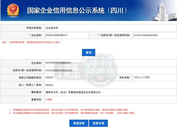 通過“查詢”進入變更頁面后,核實企業(yè)的聯(lián)絡員信息,可點擊“簡易變更”(能夠通過原聯(lián)絡員手機獲取短信)或“變更申請”(不能通過原聯(lián)絡員手機獲取短信)執(zhí)行變更操作。