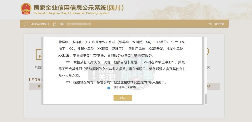 完成登錄操作,進入“企業(yè)信息填報”主界面,點擊“年度報告填寫”,閱讀“填報須知”,勾選“我已閱讀以上填報須知”并點擊“確認”。