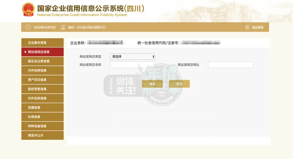 注意,此項是在“企業(yè)基本信息”中“是否有網(wǎng)站或網(wǎng)店”選擇“是”后才會顯示為可填寫狀態(tài)。進入后,點擊“添加”按鈕,填入“網(wǎng)站或網(wǎng)店名稱”及“網(wǎng)站或網(wǎng)店網(wǎng)址”,點擊“保存”。