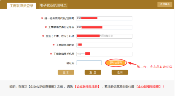 第二步:填寫工商聯(lián)絡員登錄信息,等待工商聯(lián)絡員信息自動帶出后點擊“獲取驗證碼”
