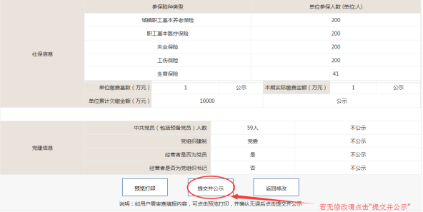 第十六步:點擊“預覽并公示”。企業(yè)確認信息無誤,可提交并公示年報信息,如需打印紙質年報請點擊頁面最下端的“預覽打印”。