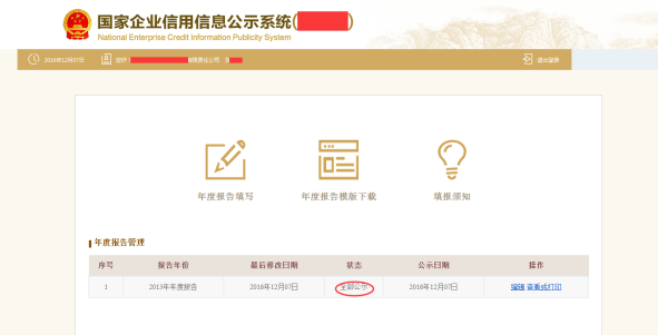 第十七步:年報公示填報成功后返回填報頁面,年度報告報送狀態(tài)為“全部公示”即為報送成功。