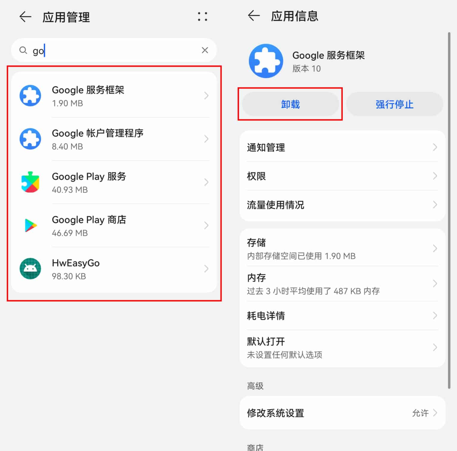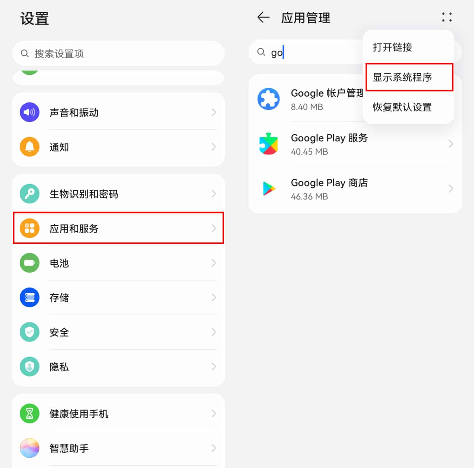 如果你之前安裝過(guò)Google套件的,需要先卸載原有Google套件,在設(shè)置->應(yīng)用和服務(wù)->應(yīng)用管理,
