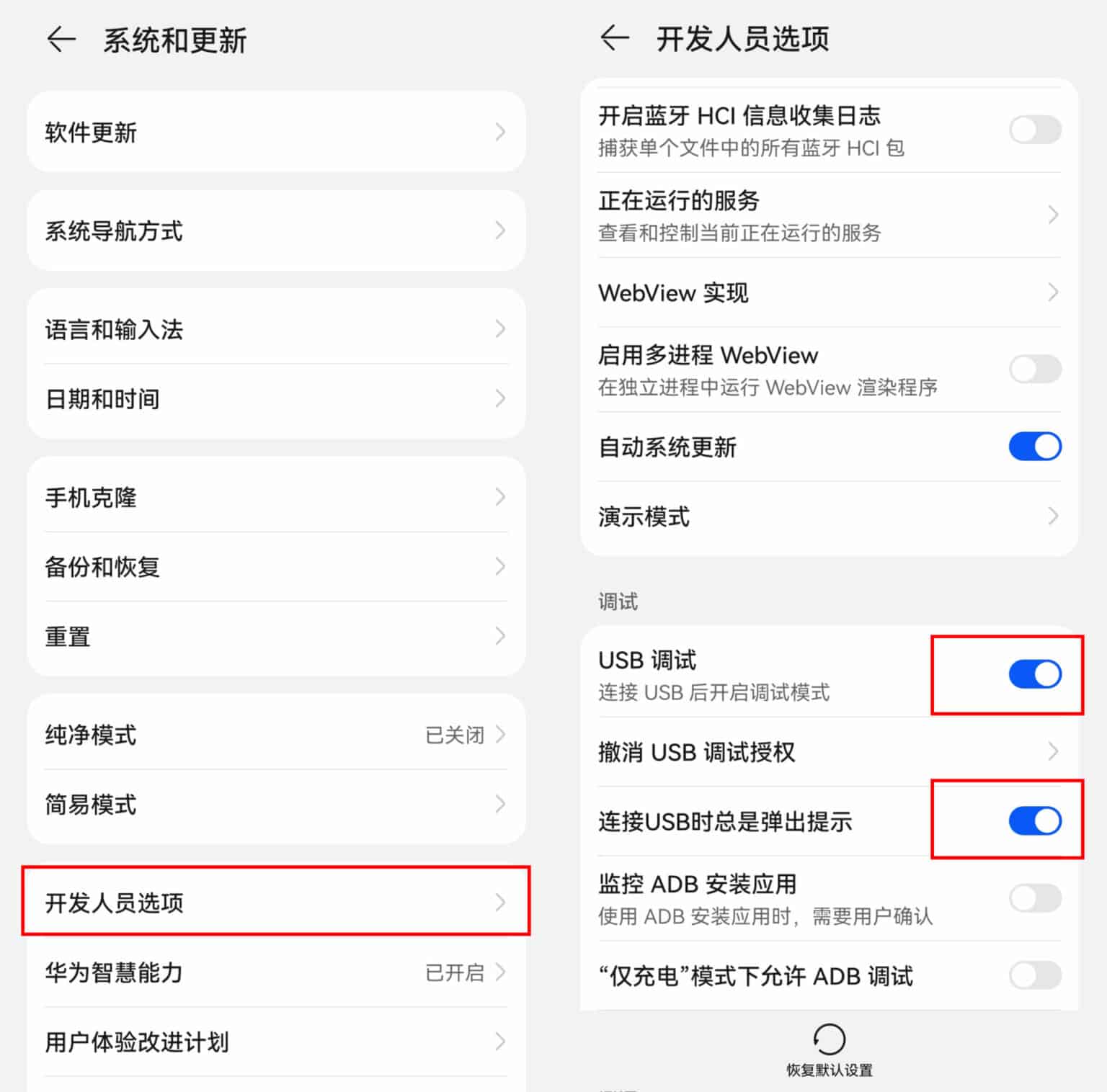 進(jìn)入到開發(fā)者模式后,點(diǎn)擊系統(tǒng)和更新之后再點(diǎn)擊開發(fā)人員選項(xiàng),在開發(fā)人員選項(xiàng)中的調(diào)試欄目下打開USB調(diào)試功能。