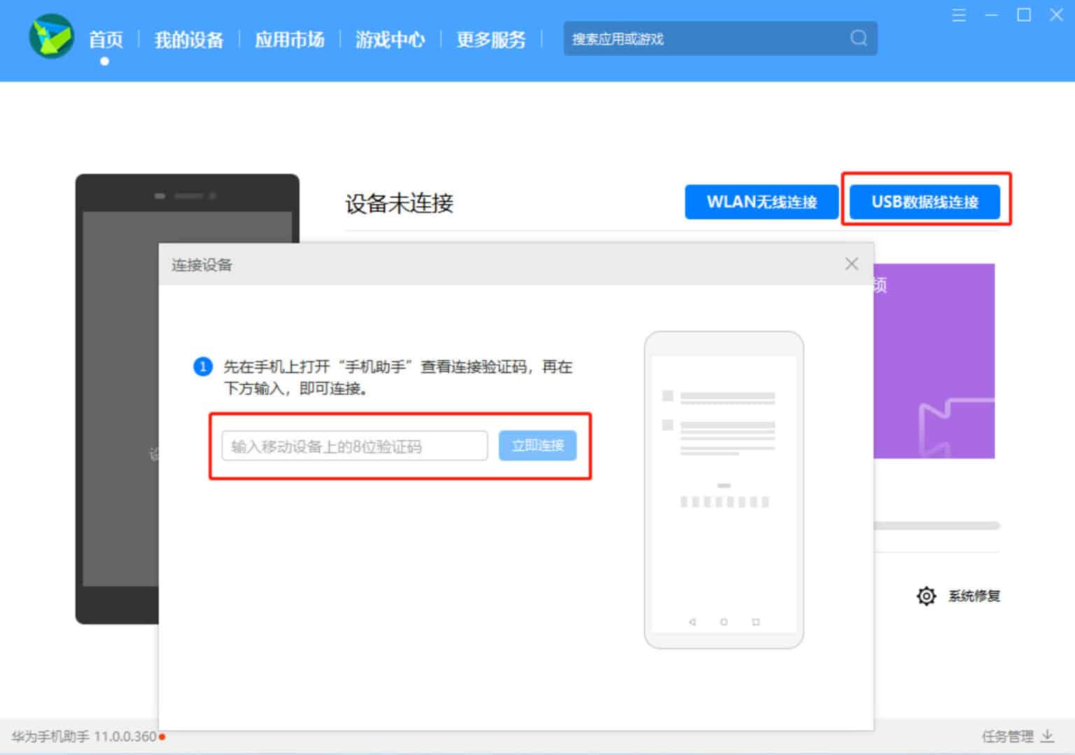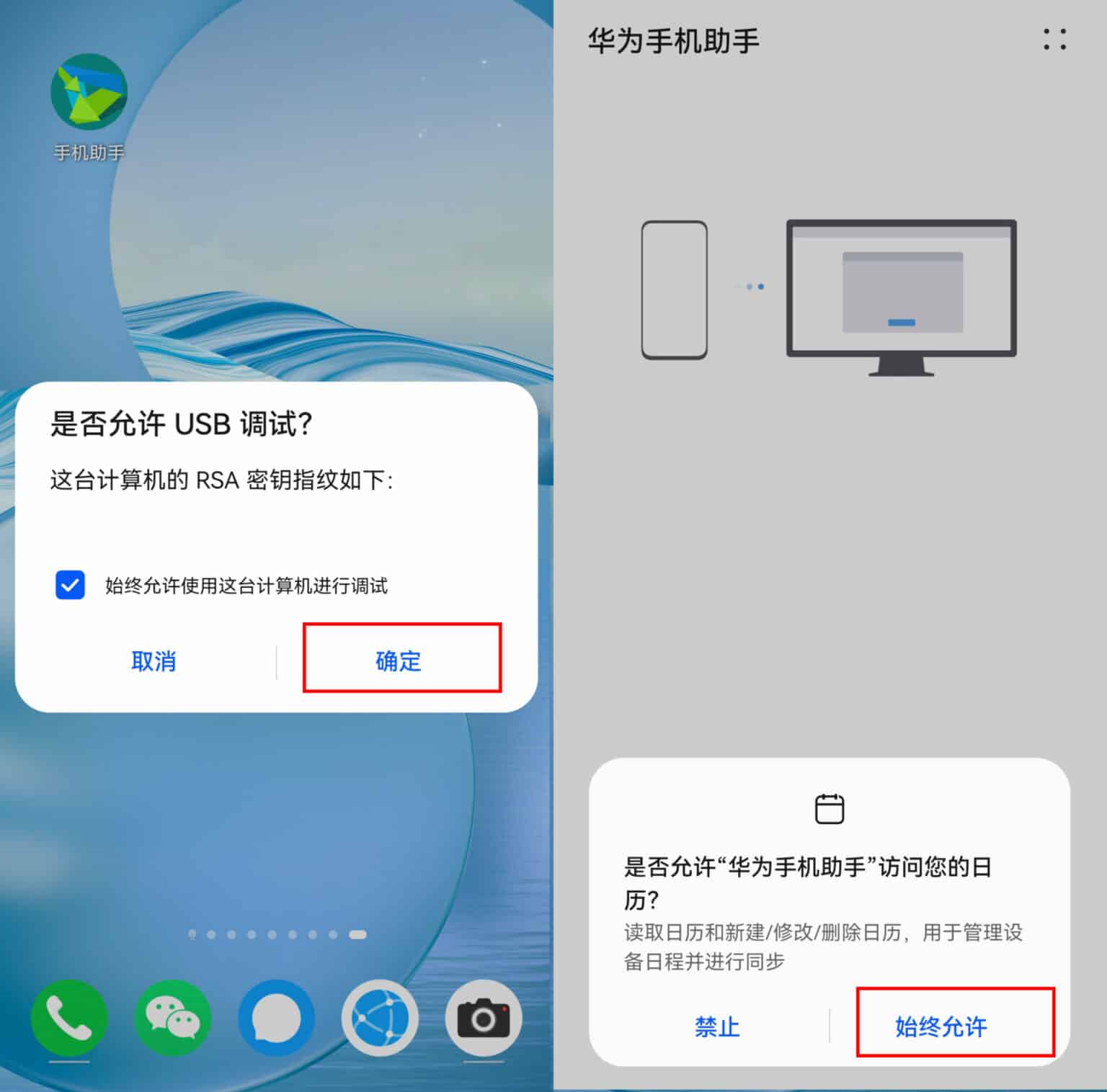 手機(jī)上的華為手機(jī)助手安裝成功后,返回到電腦端,打開電腦上的華為手機(jī)助手,重新插拔手機(jī)上的USB線連接,一定要重新插拔USB連接線,手機(jī)端才會(huì)彈出是否允許USB調(diào)試的窗口,之后點(diǎn)擊確定,然后手機(jī)會(huì)自動(dòng)跳轉(zhuǎn)到華為手機(jī)助手,一系列的授權(quán)窗口全部點(diǎn)擊始終允許,之后會(huì)彈出一個(gè)驗(yàn)證碼,在電腦端的華為手機(jī)助手中輸入驗(yàn)證碼,然后點(diǎn)擊立即連接。