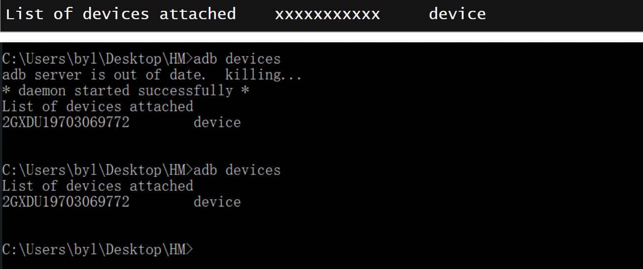 3.5. 在CMD窗口中輸入 adb devices 之后按回車,如出現(xiàn)類似下圖出現(xiàn)的內(nèi)容則代表成功。例如:
