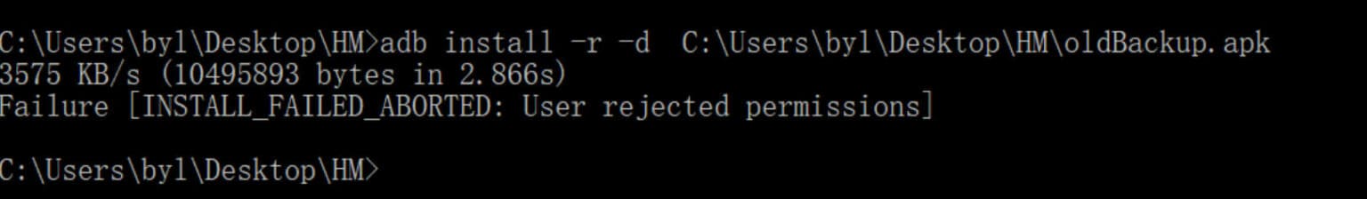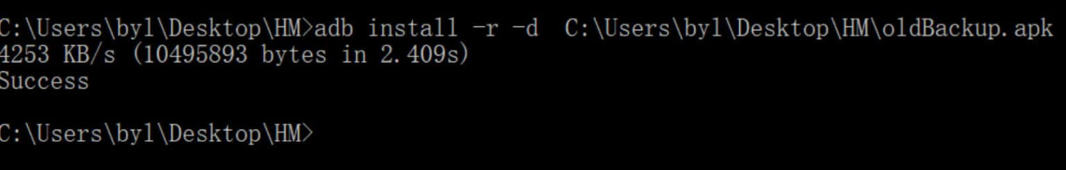 3.7. 卸載完手機(jī)自帶的備份后,需要安裝低版本的備份,返回到電腦的CMD窗口,在命令行內(nèi)輸入 adb install -r -d  C:\Users\本機(jī)電腦名稱\Desktop\HM\oldBackup.apk 之后敲擊回車,手機(jī)上彈出安裝窗口,點(diǎn)擊繼續(xù)安裝,之后點(diǎn)繼續(xù)安裝輸入鎖屏密碼后,安裝成功,點(diǎn)擊完成。出現(xiàn)下圖則代表成功。