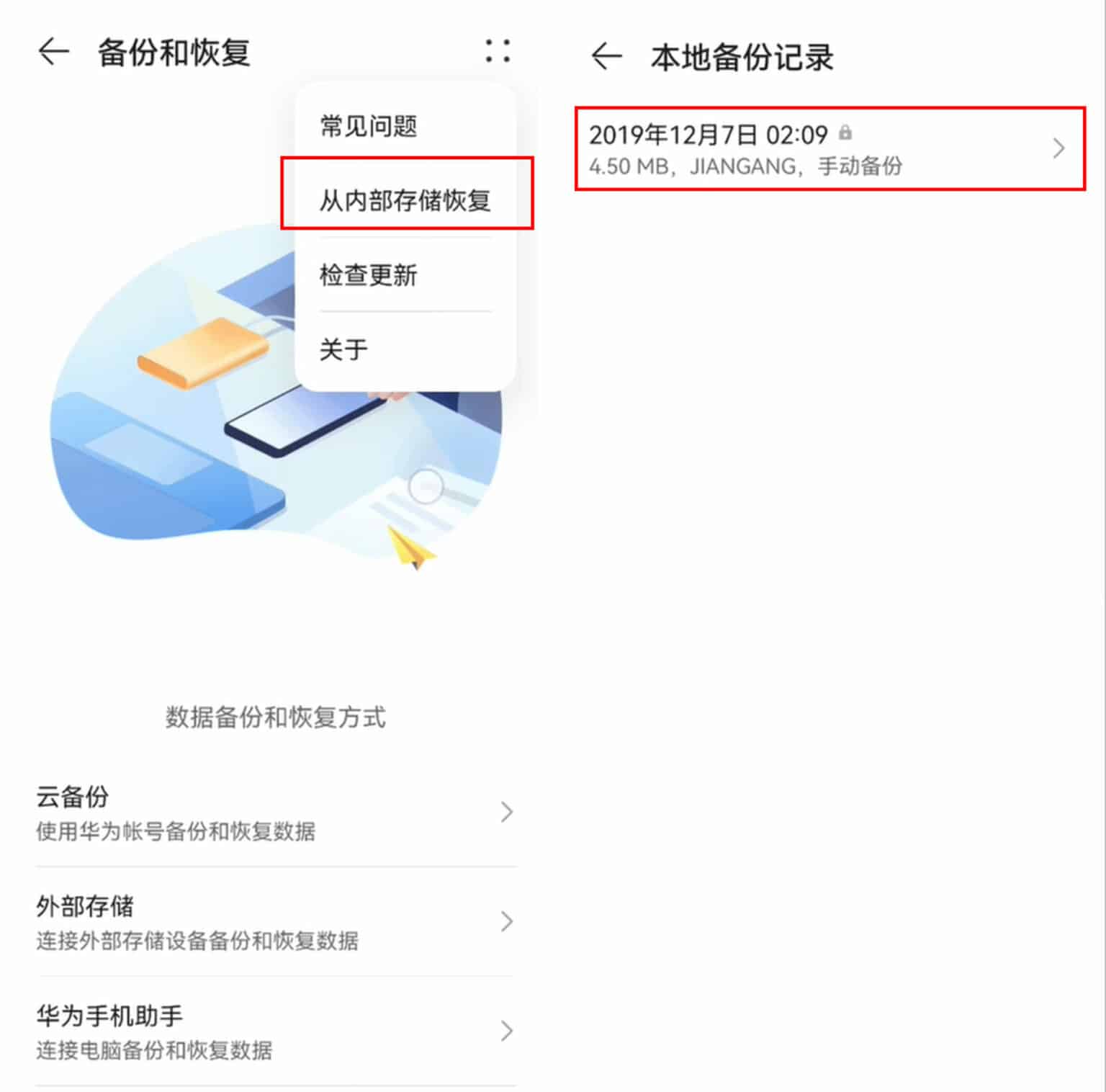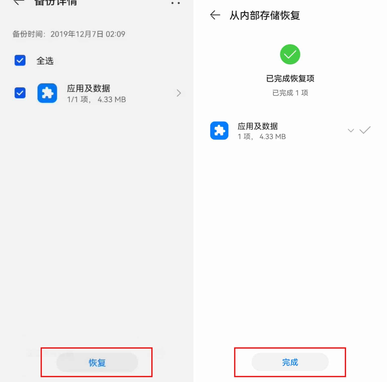 4.4.點(diǎn)擊右上角的四個(gè)小點(diǎn),之后點(diǎn)擊從內(nèi)部存儲(chǔ)恢復(fù),選擇2019年的12月7日的備份,之后點(diǎn)擊恢復(fù),輸入恢復(fù)密碼,密碼是 a12345678,恢復(fù)完畢后點(diǎn)擊完成