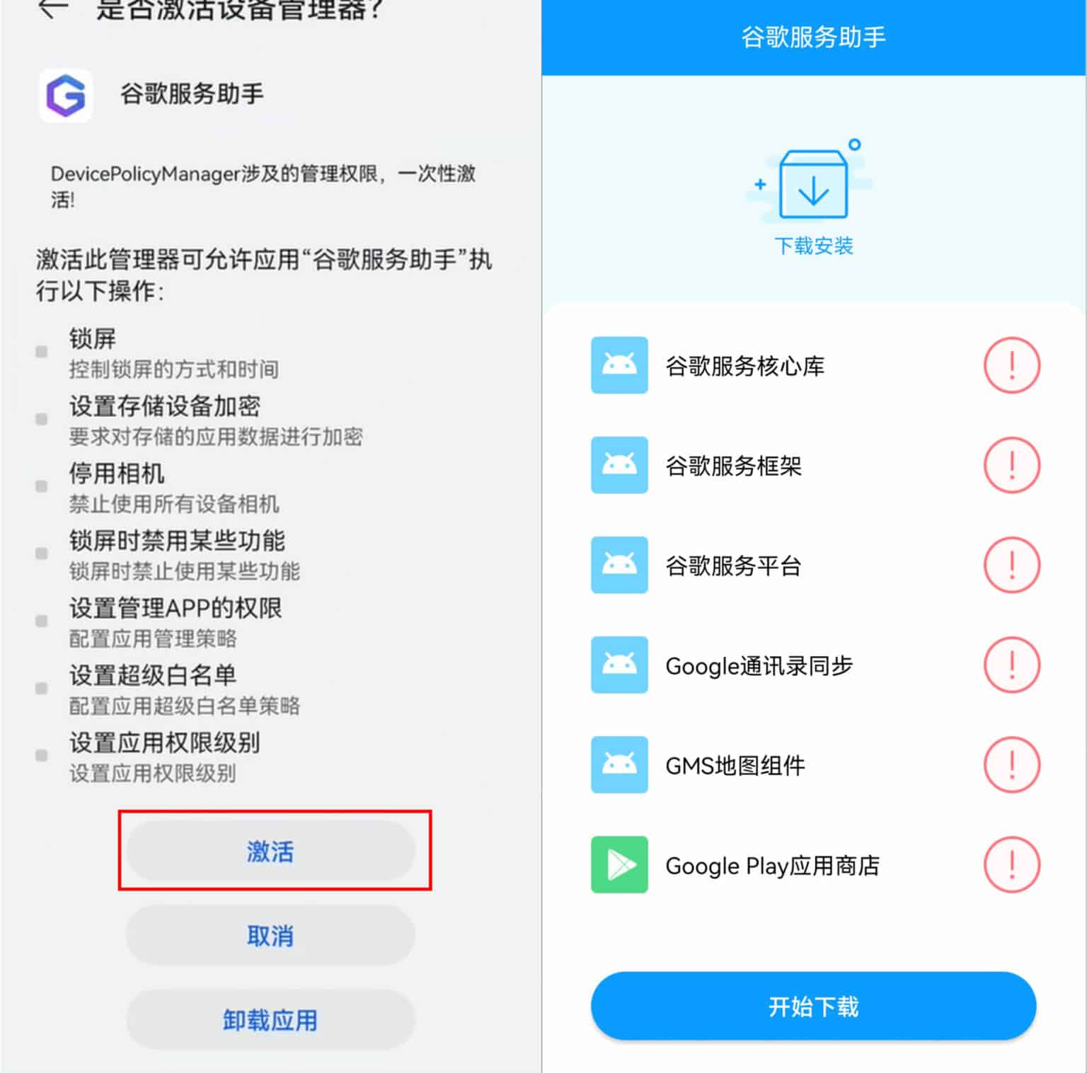 4.5.返回手機(jī)桌面,我們發(fā)現(xiàn)新安裝了一個(gè)谷歌服務(wù)助手的應(yīng)用,打開谷歌服務(wù)助手,然后點(diǎn)擊激活,之后權(quán)限選擇始終允許,到這一步就可以了,注意:不用點(diǎn)擊谷歌服務(wù)助手中的開始下載。關(guān)閉應(yīng)用后,返回到手機(jī)桌面就可以了。
