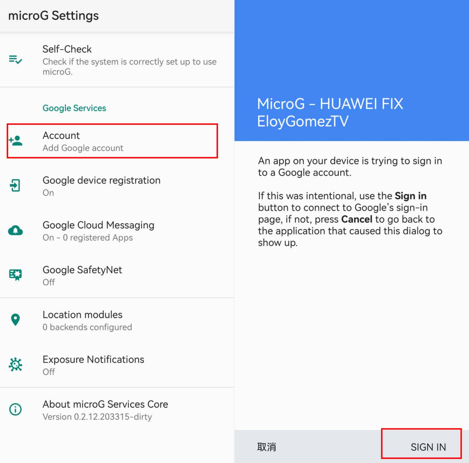 5.2.MicroG-HUAWEI FIX EloyGomezTV 安裝完畢后,打開應(yīng)用,點(diǎn)擊 Account 之后點(diǎn)擊右下角的 SIGN IN 登錄。