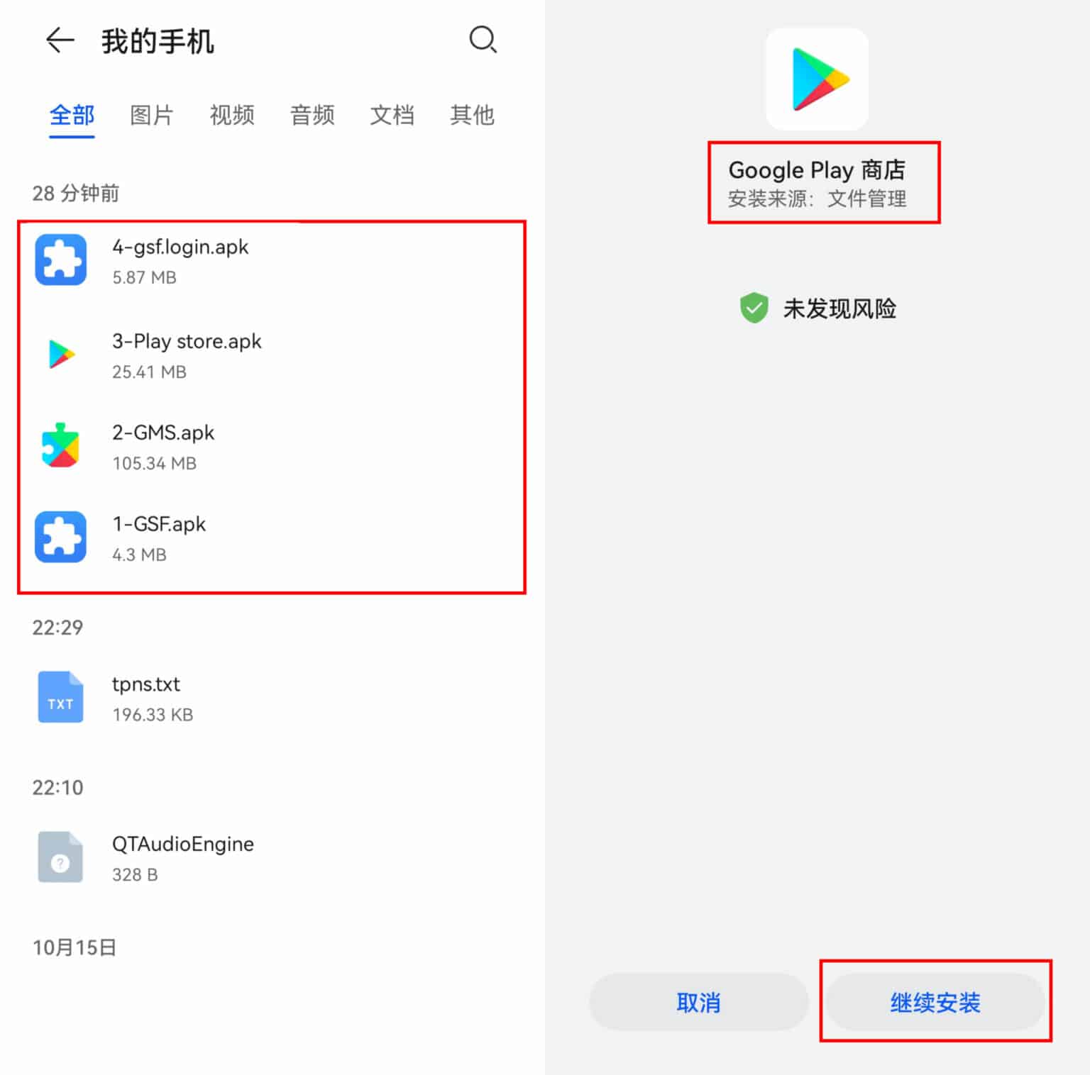 5.9.重新啟動(dòng)手機(jī)后,保持國(guó)際網(wǎng)絡(luò)的暢通,之后打開手機(jī)文件管理,再重新安裝一次 2-GMS.apk 文件。