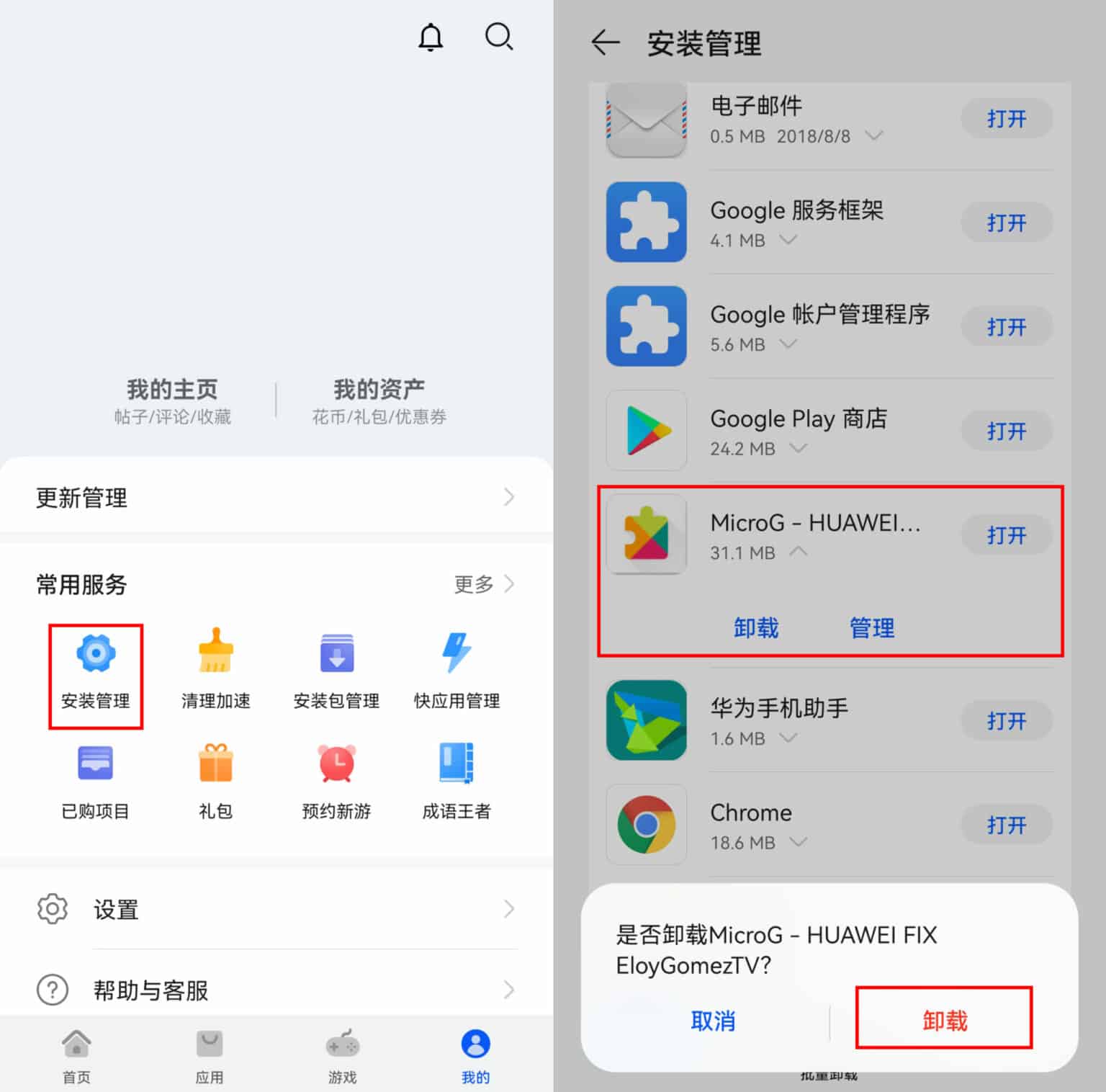 5.5.上面三個(gè)APK安裝完成后,打開手機(jī)應(yīng)用市場(chǎng),在安裝管理中找到 MicroG谷歌登錄器 進(jìn)行卸載。
