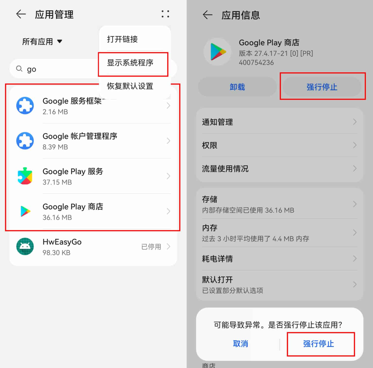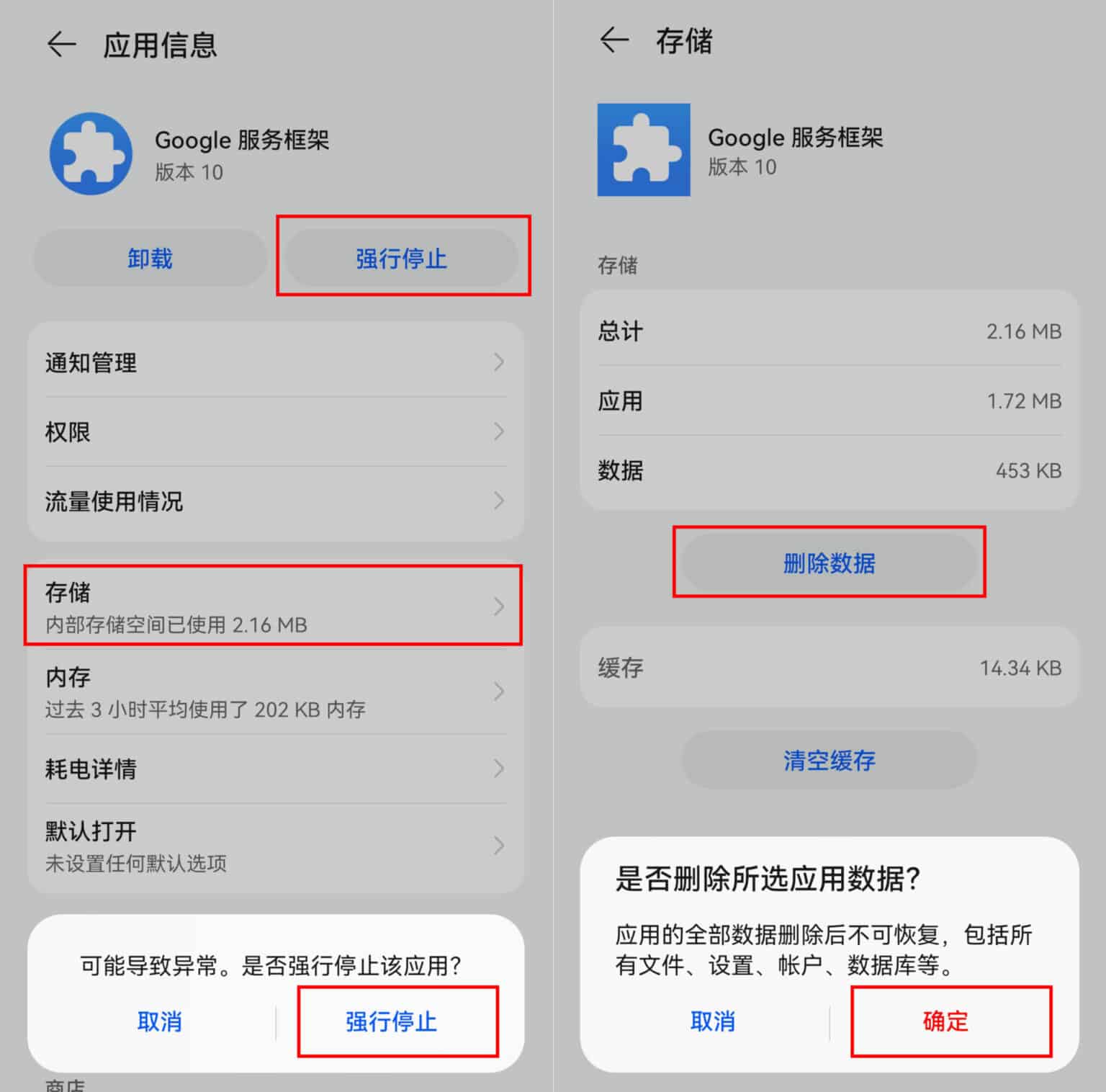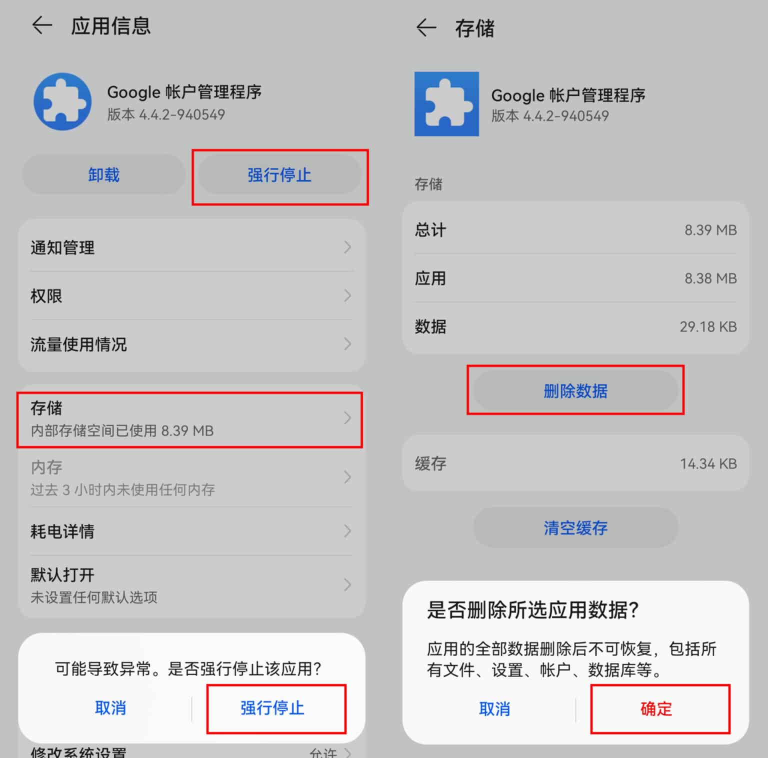 首先在應(yīng)用管理中強(qiáng)行停止 Google Play 商店,之后再?gòu)?qiáng)行停止 Google 服務(wù)框架 并 刪除數(shù)據(jù),最后強(qiáng)行停止 Google 賬戶管理程序 并 清除數(shù)據(jù)。