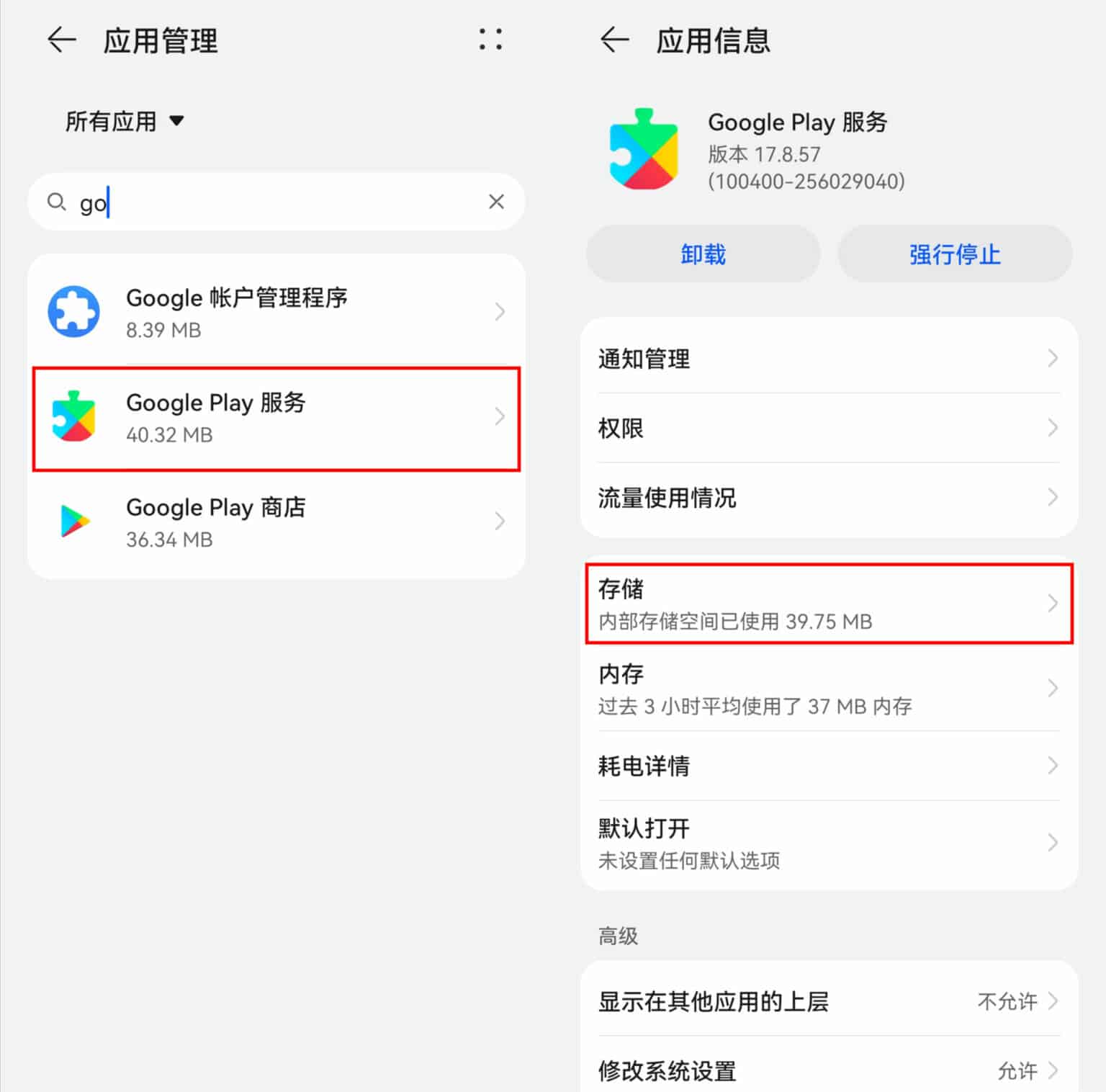 5.10.打開設(shè)置-應(yīng)用和服務(wù)-應(yīng)用管理,首先在應(yīng)用管理中強(qiáng)行停止 Google Play 商店,之后再?gòu)?qiáng)行停止 Google 服務(wù)框架 并 刪除數(shù)據(jù),最后強(qiáng)行停止 Google 賬戶管理程序 并 清除數(shù)據(jù)
