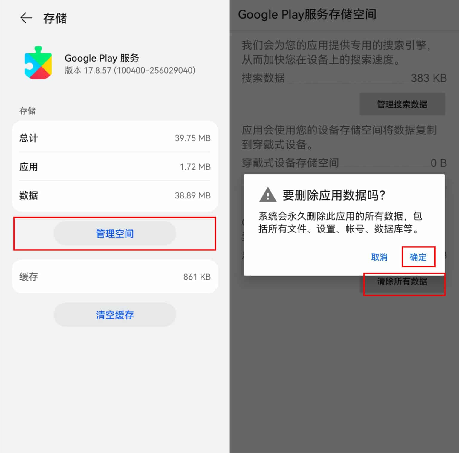 5.12.成功打開 Google Play 谷歌商店后,還需要進(jìn)行最后一步操作,打開設(shè)置,在應(yīng)用和服務(wù)中打開應(yīng)用管理,點(diǎn)擊Google Play服務(wù) 點(diǎn)擊 存儲(chǔ) 之后點(diǎn)擊 管理空間 點(diǎn)擊最下方的 清除所有數(shù)據(jù) 清除完畢后,點(diǎn)擊確定。
