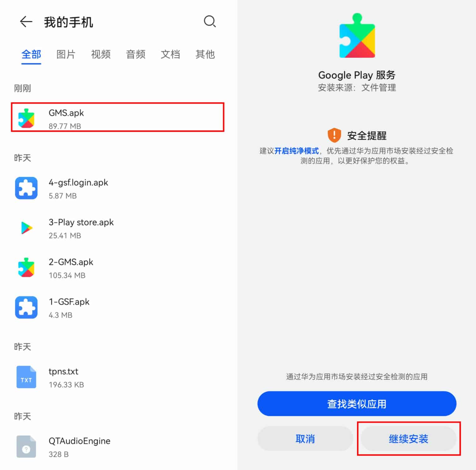 5.13.谷歌服務(wù)安裝包中的 GMS.apk 文件通過(guò)USB傳輸,復(fù)制到手機(jī)的 Download 文件夾內(nèi)并進(jìn)行安裝,安裝完成后重啟手機(jī),所有的操作就已經(jīng)全部完成了。