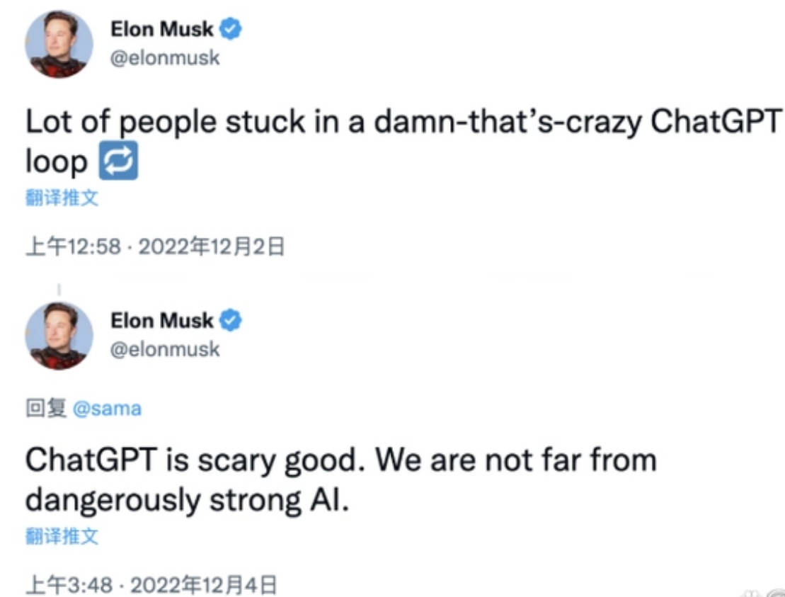 就連馬斯克也在感嘆“很多人瘋狂地陷入了 ChatGPT 循環(huán)中”,“ChatGPT 好得嚇人,我們離強(qiáng)大到危險(xiǎn)的人工智能不遠(yuǎn)了”。