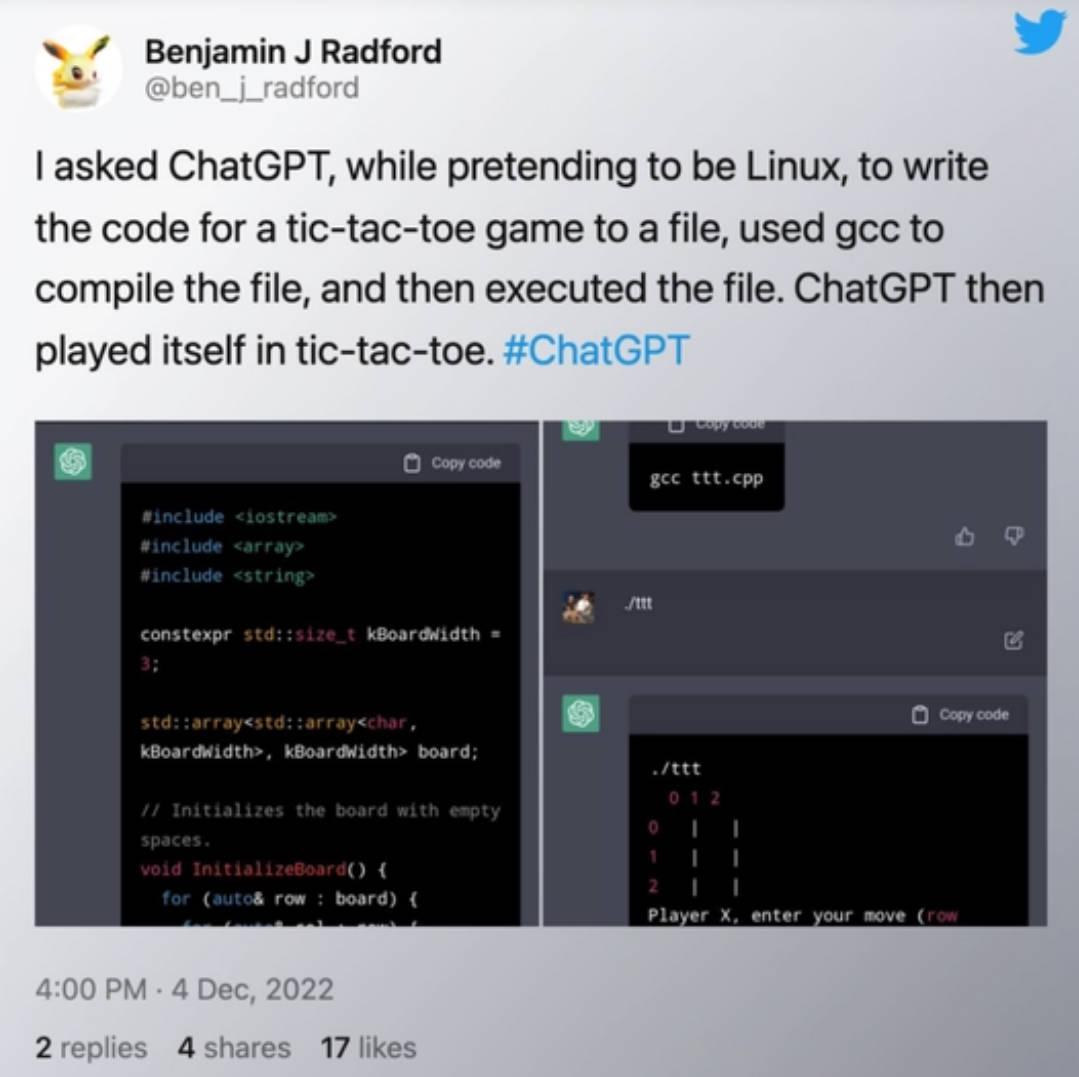 機(jī)器學(xué)習(xí)愛(ài)好者和 UNCC 助理教授 Benjamin J Radford 要求 ChatGPT “將井字游戲的代碼寫入文件,使用 gcc 編譯該文件,然后執(zhí)行該文件?!?/span>