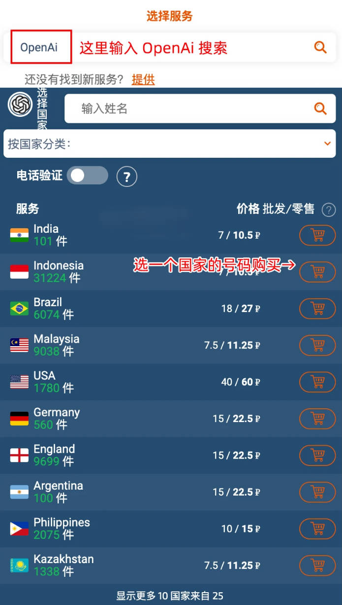 4、在左邊側(cè)邊欄上搜索 OepnAi 服務(wù),然后就能看到可申請(qǐng)不同國(guó)家的臨時(shí)手機(jī)號(hào) (如下圖),比如印度、印尼、美國(guó)的,根據(jù)價(jià)格或喜好選一個(gè),比如我選了個(gè)印度,這時(shí)就會(huì)獲得一個(gè)臨時(shí)號(hào)碼,拷貝它待用。