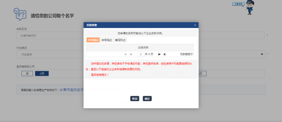 用戶填寫完信息后,點擊“提交”按鈕。系統(tǒng)根據(jù)生成的企業(yè)名稱,按照名稱校驗規(guī)則判斷名稱是否可用,并給出相應(yīng)的提示。如下圖: