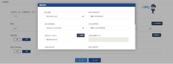 用戶閱讀系統(tǒng)提示,點擊“確認”按鈕,提交核名申請。系統(tǒng)跳轉(zhuǎn)到注冊資金及股東頁面。