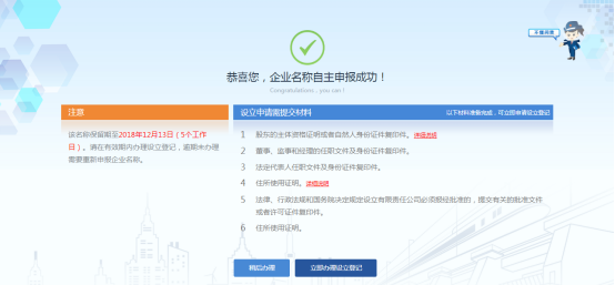 企業(yè)名稱申請成功后,用戶可以在該界面直接點擊“立即辦理設(shè)立登記“系統(tǒng)進入企業(yè)設(shè)立階段。也可點擊“稍后辦理”待設(shè)立材料準備齊全后進行設(shè)立。