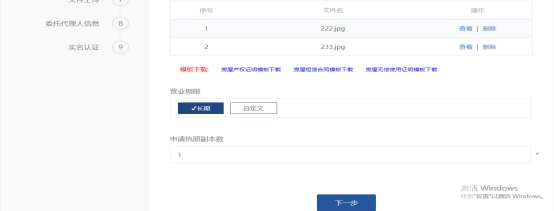用戶輸入相關(guān)信息,并且“選擇文件”并上傳到系統(tǒng)中,點擊“下一步”按鈕,系統(tǒng)自動流轉(zhuǎn)到實名認證頁面,如下圖: